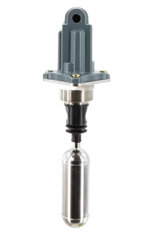 浮球液位開(kāi)關(guān)。利用浮力原理。浮子的運(yùn)動(dòng)被傳遞到一個(gè)磁鐵上,該磁鐵切換一個(gè)信號(hào)微動(dòng)開(kāi)關(guān)。浮子和外殼由一個(gè)密封的不銹鋼屏障隔開(kāi)。操作時(shí)不需要電源。